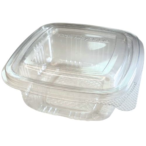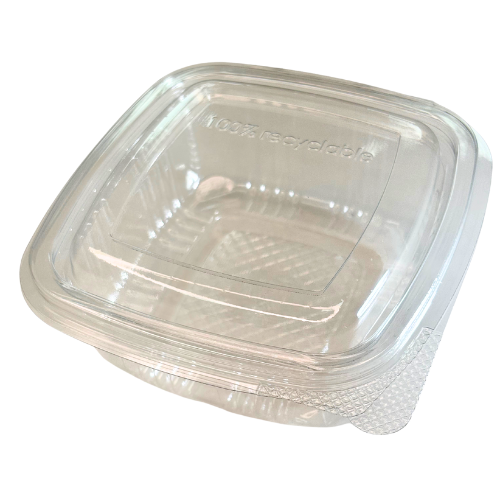 ENVASE PLASTICO 80% R-PET reciclado TRANSPARENTE TAPA UNIDA(BISAGRA) CUADRADO 250cc 117X112X41mm