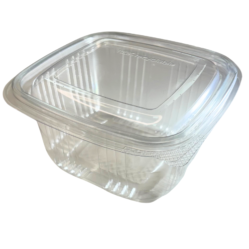 ENVASE PLASTICO 80% R-PET reciclado TRANSPARENTE TAPA UNIDA(BISAGRA) CUADRADO 500cc 134X128X64mm